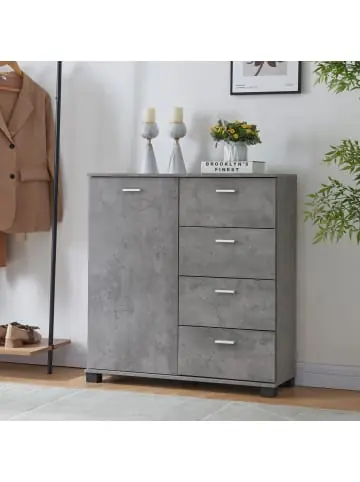 Schuhschrank Unser Schuhschrank mit einer Schranktür und vier Schubladen ist die ideale Lösung, um Ihre Schuhe und Accessoires ordentlich und stilvoll aufzubewahren. Doch dieser Schrank bietet noch mehr: Dank seines durchdachten Designs kann er auch als Sideboard in anderen Bereichen Ihres Hauses eingesetzt werden. Die Schubladen bieten zusätzlichen Stauraum für Accessoires wie Schuhbürsten, Schnürsenkel oder andere kleine Gegenstände. Der Schrank ist vielseitig nutzbar. Sie können ihn im Flur, im Wohnzimmer oder sogar im Schlafzimmer platzieren, um verschiedenste Gegenstände abzulegen. Das zeitlose Design des Schuhschranks fügt sich nahtlos in verschiedene Einrichtungsstile ein Nutzen Sie seine vielseitige Funktionalität, um Ordnung in Ihrem Zuhause zu schaffen, und verleihen Sie gleichzeitig Ihrem Raum einen Hauch von Eleganz. Produkt-Highlights: – Schrank mit einer Tür und vier Schubladen- Als Schuhschrank oder Sideboard zu verwenden- Zwei höhenverstellbare Ablagen im Schrankinnern- Für sämtliche Wohnräume geeignet- Schneller und einfacher Aufbau Maße: – Gesamt (HxBxT): 84 x 80 x 28 cm- Schubladenkorpus (HxBxT): je 14 x 36 x 25 cm- Schubladenfront (HxB): je 19 x 39,5 cm- Schranktür (HxB): 77 x 39,5 cm- Ablage im Schrankinnern (BxT): je 38 x 24 cm Material: Spanplatte Farbe: Betonoptik Lieferumfang: 1 x Flurschrank Markenware aus dem Hause: [en.casa]
