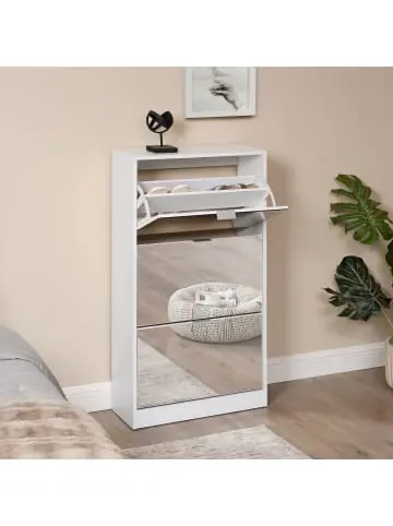 Schuhschrank Der moderne Schuhkipper vereint Eleganz und Funktionalität auf perfekte Art und Weise und bietet Ihnen die ideale Lösung zur platzsparenden Aufbewahrung Ihrer Schuhe. Mit seinem ansprechenden Design wird er zum Blickfang in jedem Raum. Der Schuhschrank verfügt über drei Kipptüren mit einer verspiegelten Türfront. Diese spiegelnde Oberfläche verleiht dem Schrank einen Hauch von Raffinesse und vergrößert optisch den Raum. Gleichzeitig ermöglicht sie Ihnen einen letzten Blick auf Ihr Outfit, während Sie Ihre Schuhe auswählen. Im Inneren des Schranks finden Sie ausreichend Platz, um Ihre Schuhkollektion ordentlich und geordnet aufzubewahren. Sein stilvolles Design und die praktische Funktionalität machen ihn zu einer vielseitigen Lösung für jeden Schuhliebhaber. Entdecken Sie mit unserer Schuhkommode eine neue Art der Schuhaufbewahrung, die Ihren Schuhen das perfekte Zuhause bietet und gleichzeitig einen Hauch von Luxus in Ihren Raum bringt. Lassen Sie sich von seiner Eleganz verzaubern und genießen Sie die Ordnung und Übersichtlichkeit, die er Ihnen bietet. Produkt-Highlights: – Ideal zum platzsparenden verstauen Ihrer Schuhe – 3 geräumige Aufbewahrungsfächer – Jedes Fach mit mittlerer Trennwand – Platz für bis zu 18 Paar Schuhe – Auch an der Wand montierbar – Schneller und einfacher Aufbau – Verspiegelte Türfront Material: Spanplatte Korpusfarbe: Weiß Maße: – Gesamt (HxBxT): 115 x 60 x 24 cm – Höhe der Türfront pro Fach: je 34,5 cm – Länge der Ablage (Innen): je 56 cm Lieferumfang: 1 x Schuhschrank inkl. Befestigungsmaterial Markenware aus dem Hause: [en.casa]