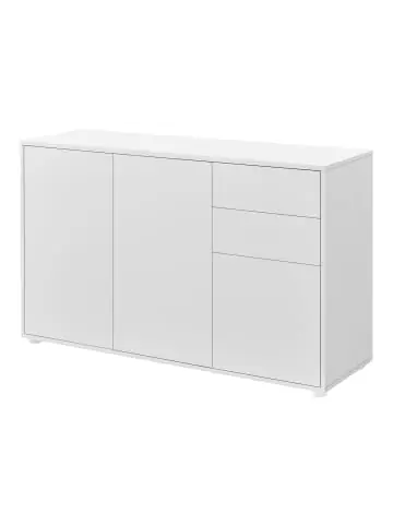 Sideboard Dieses dekorative und praktische Sideboard eignet sich perfekt für jeden Haushalt. Produktdetails: – Stylisches Sideboard mit 2 Schubladen und 3 Schranktüren – Vielseitig nutzbarer Stauraum – Müheloses Öffnen, indem auf die Tür beziehungsweise die Schublade gedrückt wird Maße: – Gesamt (HxBxT): 74 x 117 x 36 cm – Schublade Innenmaße (HxBxT): je 12 x 31,5 x 28,5 cm – Schubladenfront Höhe: je 14,8 cm – Schrankfach unter den Schubladen Innenmaße (HxBxT): je 36,3 x 37 x 33 cm – Schranktürfront unter den Schubladen Höhe: 37,5 cm – Großes Schrankfach Innenmaße (HxBxT): je 36,3 x 75 x 33 cm – Große Schranktürfront Höhe: je 68,3 cm Material: Spanplatte Farbe: Weiß, matt Lieferumfang: 1 x Sideboard Markenware aus dem Hause: [en.casa]