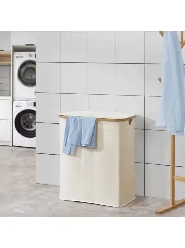 Wäschekorb Der elegante und praktische Wäschesammler ist ideal für Ihren Haushalt. Er macht das Sammeln und Sortieren Ihrer schmutzigen Wäsche zum Kinderspiel und sorgt somit für Ordnung in ihrem Zuhause. Der Wäschebehälter bietet durch seine großzügigen Abmessungen und den drei herausnehmbaren Wäschesäcken ausreichend Platz für Ihre Wäsche, wodurch Sie sich keine Sorgen mehr machen müssen, dass schmutzige Kleidung herumliegt. Der Deckel verhindert zudem unangenehme Gerüche durch Schmutzwäsche. Außerdem verfügt der Wäschekorb über praktische Seitengriffe, die ein müheloses Transportieren von einem Raum zum anderen ermöglichen. Ein weiterer Vorteil ist die einfache und schnelle Möglichkeit, den Korb bei Bedarf zusammenzuklappen und platzsparend zu verstauen, wenn er gerade nicht benötigt wird. Egal ob im Schlafzimmer, Badezimmer oder in der Waschküche – unsere Wäschebox fügt sich nahtlos in jede Umgebung ein. Mit ihrem schlichten und dennoch stilvollen Aussehen ergänzt sie die Einrichtung Ihres Hauses auf elegante Art und Weise. Durch das atmungsaktive Mesh-Gewebe der Wäschesäcke wird eine optimale Luftzirkulation gewährleistet, wodurch die gelagerte Wäsche stets frisch und gut belüftet bleibt. Der Wäschekorb besteht zudem aus feuchtigkeitsresistentem Material, sodass die nasse Wäsche auch nach dem Waschgang problemlos mit dem Korb transportiert werden kann. Produkt-Highlights: – Eleganter und praktischer Wäschesammler – Sortierung durch drei herausnehmbare Wäschesäcke – Deckel verhindert unangenehme Gerüche – Griffe an den Seiten für mühelosen Transport – Wäschesäcke sind atmungsaktiv durch Mesh-Gewebe – Wäschekorb aus feuchtigkeitsresistentem Material – Korb platzsparend zusammenklappbar – Schafft Ordnung im Haushalt Fassungsvermögen: 140 L Material: – Rahmen: Bambus – Wäschekorb: Oxford 600D (100% Polyester mit PVC-Beschichtung) – Wäschesack: Mesh-Gewebe (100% Polyester) Maße (HxBxT): 69 x 57 x 37 cm Farbe: Beige Lieferumfang: – 1 x Wäschekorb – 3 x Einhängbarer Wäschesack Markenware aus dem Hause: [en.casa]