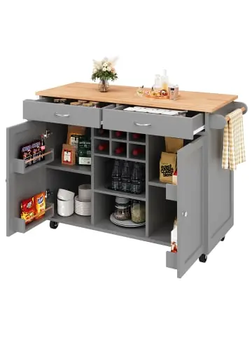 Multifunktionaler Küchenwagen mit Weinregal (102x45x92 cm)Design-Highlights: ✔ Hochwertige MDF-Platte mit Holzoptik & pflegeleichter Oberfläche ✔ Edle Zinkgriffe für modernen Look ✔ Flexibles Weinregal (abnehmbar & verstellbar) ✔ Praktische Seitenablagen für zusätzlichen StauraumFunktionale Vorteile:Mobile Nutzung: 360°-Lenkrollen mit FeststellfunktionAnpassbarer Innenraum: Verstellbare TrennwändeHohe Tragkraft: Bis 75 kg belastbarPlatzsparendes Design: Ideal für kleine Küchen ▸ Maße: 102 x 45 x 92 cm ▸ Material: Metallrahmen + MDF-Platte ▸ Gewicht: 39,6 kg ▸ Montagezeit: ~30 MinutenEinsatzmöglichkeiten: ✓ Küchenhelfer ✓ Esszimmer-Anrichte ✓ Wohnzimmer-Sideboard ✓ Mini-BarLieferumfang: 2 Pakete | Komplettes MontagematerialBesondere Features:Leicht zu reinigende OberflächenStabiler Stand durch arretierbare RollenZeitloses Design passt zu jedem EinrichtungsstilIhr vielseitiger Alltagshelfer – stylisch & praktisch zugleich!