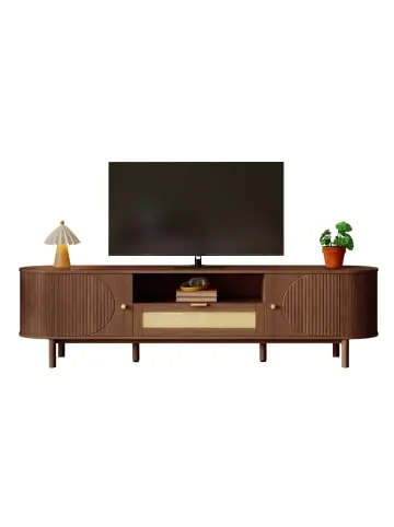 Organisches Design & hochwertige Materialien:Geschwungener Korpus mit feiner Holzmaserung für einen warmen, modernen Look.Halbrunde Seitentüren bieten diskreten Stauraum.Integrierte Rattan-Schubladen für einen natürlichen Akzent und praktische Aufbewahrung.Metallbeine in Holzoptik sorgen für Stabilität und einen dezenten Kontrast.Praktische Aufteilung & Zugänglichkeit:Offenes Mittelfach für schnellen Zugriff auf TV-Gerät, Soundbar oder Media-Player.Leichtgängige Schubladen mit Auszugsystem für Fernbedienungen, Kabel oder kleine Accessoires.Großzügiger Stauraum in den Seitenschränken für größere Geräte oder Unterhaltungsmedien.Robust & vielseitig:Hochwertige Plattenmaterialien für Stabilität und Langlebigkeit.Passt ideal zu modernen, skandinavischen und naturbezogenen Einrichtungsstilen.Perfekt für Wohnzimmer, Unterhaltungsräume oder Schlafzimmer.Ein stilvoller und funktionaler TV-Schrank, der durch seine weichen Formen, natürlichen Materialien und durchdachte Organisation überzeugt – für ein harmonisches und aufgeräumtes Wohnambiente.