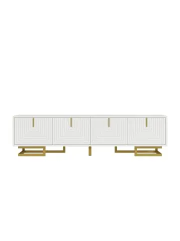 Media TVStänder mit Goldakzenten (160×38×44.5 cm)DESIGNHIGHLIGHTS: ✔ Premium TexturOberfläche in edlem Weiß ✔ Luxuriöse Goldakzente an Griffen & Metallfüßen ✔ Markante Türdesigns für LichtSchattenSpielFUNKTIONALE VORTEILE:Großzügiger Stauraum: 4 Türen mit integrierten RegalenStabile Konstruktion: 60 kg TragkraftVerstellbare Füße (11,5 cm) für unebene BödenSoftClose Scharniere für sanftes SchließenTECHNISCHE DATEN: ▸ Material: Hochwertige Spanplatte ▸ Farbe: Weiß mit GoldDetails ▸ Gewicht: 25,15 kg (1 Paket) ▸ Besonderheit: Kein HochglanzPRAKTISCHE PLUSPUNKTE: ✦ Versteckte Aufbewahrung für MediaEquipment ✦ Modernes StatementPiece fürs Wohnzimmer ✦ Leicht zu reinigende Oberfläche ✦ Zeitloses Design passt zu vielen EinrichtungsstilenLIEFERUMFANG: ✓ 1 Paket (fertig vormontierte Komponenten) ✓ Montagezubehör“Wo Stauraum auf stilvolle Eleganz trifft – der perfekte Rahmen für Ihre Unterhaltungselektronik!“IDEAL FÜR: • Designbewusste Haushalte • HomeEntertainmentSysteme • Minimalistische WohnkonzepteHINWEIS: Geringe Farbabweichungen möglich.