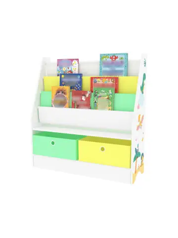 Kinderregal Das Bücherregal ist ideal fürs Kinderzimmer und bietet durch die drei offenen Ablagefächer und die unteren zwei Aufbewahrungsboxen ausreichend Stauraum, für bspw. Bücher oder Spielzeug. Produktdetails: – 3 Ablagefächer zum platzsparenden Verstauen von Büchern oder Schulheften – Zusätzlicher Stauraum durch 2 faltbare Aufbewahrungsboxen – Dekorative Seitenwand mit Dinosaurier-Motiv – Schneller und einfacher Aufbau Belastbarkeit: – Ablagefach: je max. 3 kg – Faltbox: je max. 5 kg Material: – Regal: 12mm Spanplatte – Aufbewahrungsbox: Vliesstoff (100% Polyester) Maße: – Gesamt (HxBxT): 74 x 71 x 23 cm – Aufbewahrungsbox (HxBxT): 12 x 34 x 23 cm – Abstand vom Boden zur Ablage: 28 cm – Länge Ablagefach: je 68,5 cm – Höhe Ablagefach: je 25,5 cm Farbe: Weiß / Grün / Gelb Lieferumfang: – 1 x Kinderregal – 2 x Aufbewahrungsbox – 1 x Aufbauanleitung Markenware aus dem Hause: [en.casa]