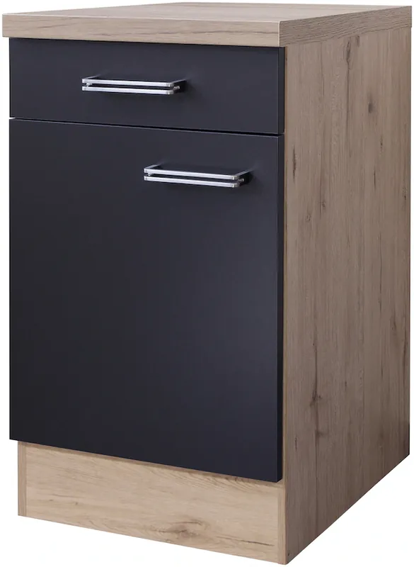Küchenunterschrank mit pflegeleichter Oberfläche von Flex-Well, Made in Germany. Türanschlag frei wählbar. Mit 38 mm starker Arbeitsplatte, Metallgriff. Günstiger Küchenschrank in guter Qualität. Schnelle Lieferzeit bis in die Wohnung