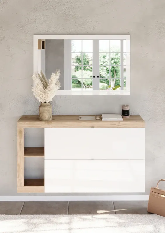 BLICKFANG IM EINGANGSBEREICH: Der dekorative Rahmen bietet einen besonderen Blickfang. Das ist die geeignete Lösung für die Organisation von Schuhen in Ihrem Eingangsbereich.. ORDNUNG MIT STIL: Der Schuhkipper mit 2 Klappen, Metallgriffe und 4 Fächern plus 2 Ablagefächern bietet übersichtlich Platz für ca. 20 Paar Schuhe – praktisch und elegant zugleich.. FLEXIBEL EINSETZBAR: Der Schuhkipper mit Doppeltrommeln kann stehend oder hängend montiert werden – ideal für jede Raumsituation.. WANDNAH & STAURAUMOPTIMIERT: Mit 133 cm Breite und nur 28 cm Tiefe bietet der Schuhkipper viel Stauraum bei minimalem Platzbedarf.. LANGLEBIG & PFLEGELEICHT: Die melaminbeschichtete Oberfläche macht die Schuhkommode robust und pflegeleicht. Gefertigt aus stabilem, FSC®-zertifiziertem Holzwerkstoff.