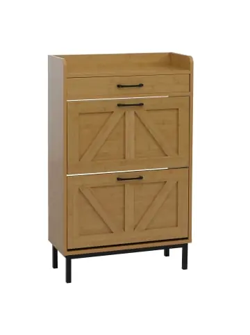 – Markeninhaber TÜV-Süd QM zertifiziert mit Nr. 12 100 59626 TMS für Qualitäts-Management in Deutschland – Stauraum in 2 Klappfächern – Mit einer Schublade – Inklusive Ablagefach – Mit Vorrichtung für Wandbefestigung – Platz für ca. 4-12 Paar Schuhe (je nach Schuhgröße) – Stabiles Material – Alltagstaugliche, pflegeleichte Oberfläche – Inklusive Fußbodenschoner – Maximale Dauerbelastbarkeit je Kippfach: 4 kg- Dieser Schuhkipper bietet mit zwei praktischen Kippfächern Platz für etwa vier bis zwölf Paar Schuhe und wird durch eine zusätzliche Schublade sowie ein Ablagefach ergänzt, sodass Sie Ihren Eingangsbereich stilvoll, übersichtlich und besonders platzsparend organisieren können.- Durch das stabile Material, die pflegeleichte Oberfläche und die integrierte Vorrichtung zur Wandbefestigung steht der Schuhkipper sicher und sorgt gleichzeitig dafür, dass Ihre Schuhe jederzeit gut verstaut und dennoch leicht zugänglich bleiben. Maße (HxBxT) (ca.):Gesamt: 95x60x24 cmAblagefach: 6x57x22 cmSchublade: 6x54x19,5 cmFach Schuhkipper oben: 10,5×55,5×26 cmFach Schuhkipper unten: 12,5×55,5×26 cmTüren: 31x57x1,5 cmHöhe Füße: 11 cm Material:Korpus: MDF aus Paulownia und Pine, MelaminbeschichtungGriffe: AluminiumlegierungFüße: Metall, pulverbeschichtetFußbodenschoner: Polypropylene Der Schuhkipper vereint modernes Design mit praktischer Funktionalität und schafft eine aufgeräumte Atmosphäre im Eingangsbereich, ohne dabei viel Platz zu benötigen. Mit seinen zwei übersichtlich gestalteten Kippfächern bietet er Stauraum für etwa vier bis zwölf Paar Schuhe und ermöglicht eine strukturierte Organisation, bei der jeder Handgriff sitzt. Die beiden Klappfächer sind so konzipiert, dass sie sich leicht öffnen lassen und den Zugriff auf die Schuhe besonders angenehm machen. Jedes Fach ist bis zu 4 kg belastbar, wodurch auch schwerere Modelle sicher verstaut werden können. Ergänzt wird der Stauraum durch eine praktische Schublade, die ideal für kleinere Utensilien wie Schuhpflege, Handschuhe oder Schlüssel ist. Das zusätzliche Ablagefach oberhalb bietet Platz für dekorative Akzente oder Alltagsgegenstände, die schnell griffbereit sein sollen. Der Schuhkipper überzeugt zudem durch ein stabiles Material und eine pflegeleichte Oberfläche, die den täglichen Anforderungen gerecht wird und sich mühelos reinigen lässt. Gleichzeitig sorgt die integrierte Vorrichtung zur Wandbefestigung dafür, dass das Möbel sicher steht und selbst bei häufiger Nutzung stabil bleibt. Dank seiner kompakten Bauweise fügt sich das Modell harmonisch in verschiedenste Wohnstile ein und eignet sich ideal für schmalere Flure und kleinere Wohnbereiche. Die durchdachte Kombination aus Funktionalität, angenehm leichtgängiger Kippmechanik und zusätzlichem Stauraum schafft ein Möbelstück, das den Alltag spürbar erleichtert und zugleich mit einer klaren, modernen Optik überzeugt.Versandzustand: Zerlegt–Sicherheitshinweise für Teilartikel mit Artikelnummer 139879 Dieser Artikel ist ein Schrank und sollte nur als solcher benutzt werden. Der Artikel ist nur für den Innenbereich geeignet. Überladen Sie den Artikel nicht. Vorsicht: Verletzungsgefahr! Setzen, stellen oder stützen Sie sich nicht auf den Artikel.Vorsicht Erstickungsgefahr! Verpackungsmaterial, wie Plastikbeutel, gehören nicht in Kinderhände. Bitte von Babys und Kleinkindern fernhalten! Nicht über den Kopf ziehen! Vorsicht: Verschluckungsgefahr! Achtung dieser Artikel kann verschluckbare Kleinteile enthalten! Halten Sie die Kleinteile von Kindern fern! Prüfen Sie den Artikel regelmäßig alle 3-6 Monate auf Beschädigungen und gelöste Verbindungen. Ziehen Sie lose Schrauben wieder fest an! Sollten Beschädigungen entdeckt werden, darf der Artikel nicht mehr genutzt werden! Warnung: Kippgefahr, Unfallgefahr und Verletzungsgefahr!Ein Möbelstück, das nicht an der Wand befestigt wird, kann wenn es umfällt ein Kind oder einen Erwachsenen schwerwiegend oder sogar tödlich verletzen. Befestigen Sie daher alle Möbel mit Winkeln oder speziellen Kippschutzen (teilweise nicht im Lieferumfang enthalten) an der Wand. Achten Sie dabei immer auf mögliche Kabel oder Rohre die in der Wand verlegt sein können.Benutzen Sie diesen Artikel nur für die bestimmungsgemäße Verwendung, im technisch einwandfreien Zustand und für private Zwecke. Andere Verwendungen gelten als nicht bestimmungsgemäß und können zu schweren Verletzungen und Beschädigungen führen. Für aus bestimmungswidriger Verwendung entstandene Schäden übernimmt der Hersteller keine Haftung.Allgemeine Hinweise: Bitte lesen Sie alle Hinweise sorgfältig durch, bevor Sie den Artikel aufbauen und verwenden. Verwahren Sie alle Sicherheitsinformationen und Aufbauanleitungen gut auf. Für Ihre eigene Sicherheit und die Ihres Produktes, befolgen Sie bitte die Sicherheitshinweise. Eine falsche Handhabung könnte zu ernsten Verletzungen, beschädigtem Eigentum oder sogar dem Tod hinauslaufen.Pflegehinweise: Verwenden Sie eine weiche Bürste um losen Schmutz zu entfernen. Keine Waschmaschinenwäsche für das Stoffdach! Wenn dann Handwäsche mit lauwarmem Wasser (max. 30 °C), Mildes Reinigungsmittel (kein Bleichmittel, keine Lösungsmittel) weiche Bürste oder Schwamm, anschließend gründlich ausspülen, komplett trocknen lassen, bevor es wieder montiert oder verstaut wird Entsorgungshinweise: Entsorgen Sie den Artikel umweltgerecht. Überlegen Sie Alternativen zu Entsorgung wie Spenden oder Verkaufen. Elektrische Artikel gehören nicht in den Hausmüll. Entsorgen Sie diese an einem Recyclinghof für elektrische und elektronische Altgeräte, weitere Informationen erhalten Sie bei Ihrer örtlichen Gemeindeverwaltung. Einlagerungshinweise: Der Artikel sollte trocken und sauber sein, verwahren Sie diesen geschützt in dem Karton in dem er geliefert wurde.