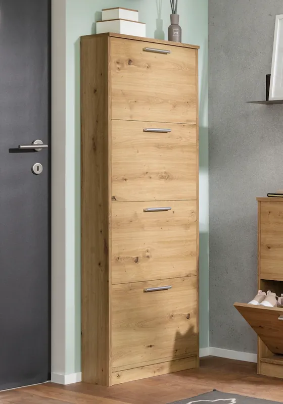 Maße B/T/H 55/21/157 cm. 4 Klappen. Für 12 Paar Schuhe