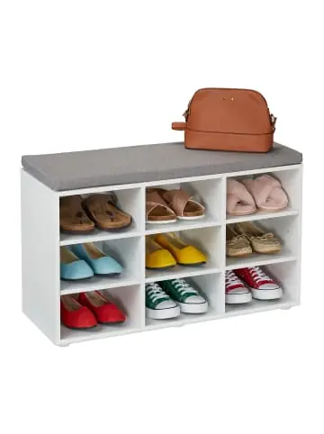 Die gepolsterte Schuhsitzbank ist das ideale Möbelstück für Deine Garderobe. Das dezente Design fügt sich in jede Einrichtung und bietet mit dem grauen Sitzpolster einen bequemen Platz zum Anziehen der Schuhe. In der Schuhkommode sind Hausschuhe, Sneakers oder anderweitige Accessoires gut aufgehoben. Die gemütliche Polsterbank mit praktischem Stauraum ist auch im Schlaf- und Wohnzimmer eine praktische Aufbewahrungsmöglichkeit.Schuhbank im Detail – Schuhbank mit 9 Fächern: H x B x T: ca. 48 x 78,5 x 30 cm / ca. 12,5 kg- Schuhbank mit 12 Fächern: H x B x T: ca. 48 x 104 x 30 cm / ca. 16,4 kg – Schuhbank mit 15 Fächern: H x B x T: ca. 48 x 105 x 30 cm / ca. 19,5 kg – Traglast: ca. 136 kg bzw. 200 kg (15 Fächer) – Material: Holzwerkstoff, Polyester, Schaumstoff – Farbe: Weiß, GrauFlurbank mit Schuhaufbewahrung – Höhe der Außenfächer variabel auf ca. 6, 13 oder 20 cm – Höhe des Sitzpolsters: ca. 3 cm Garderobenbank mit Sitzpolster – Stilvolle Flursitzbank mit Schuhablage in Weiß – Mit verstellbaren Einlegeböden für verschiedene Schuhe – Weiches Sitzkissen mit grauem Stoffbezug – Modernes Design, passend zu jedem Einrichtungsstil – Vielseitig einsetzbar für Flur, Schlaf- und Wohnzimmer – Praktische Kunststoff-Füße zum Schutz des BodensLieferumfang – 1x Schuhbank mit Fachanzahl nach Wahl (in Einzelteilen) – Inkl. Aufbauanleitung und Montagematerial – Dekoartikel sind nicht im Lieferumfang enthalten