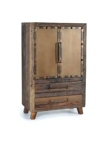 Sideboard aus Holz, das aus Eisenbahnschwellen gewonnen wurde, was ihm ein authentisches und entschieden ökologisches Wesen verleiht. Es ist mit zwei Türen und zwei Schubladen ausgestattet und bietet sowohl Stil als auch Funktionalität. Mit den Maßen 120 cm hoch, 75 cm breit und 40 cm tief ist dieses Möbelstück eine kompakte Lösung für funktionalen Stauraum. Seine natürliche Farbe in Kombination mit oxidierten Türen bietet einen auffälligen visuellen Kontrast. Der Versand erfolgt in einem Einzelpaket mit den Maßen 127 x 80 x 47 cm und einem Gesamtgewicht von 60 kg. Wood