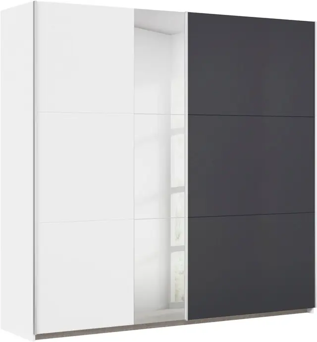 Moderner Schwebetürenschrank in zeitloser Optik. Praktische Teilspiegelfront. rauch Easy-Slide-Funktion für ein sanftes, leises Öffnen der Schwebetüren. Die Fachböden und Kleiderstangen können variabel in den Schrankelementen eingesetzt und in der Höhe verstellt werden. Made in Germany! Ausgezeichnet mit dem blauen Umweltengel und dem Goldenen M für geprüfte Möbel
