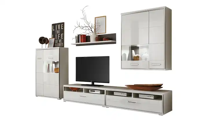 Praktischer Nutzen und Design vereinen sich bei der Wohnwand Setto von uno. Die Wohnwand bietet viel Platz im Inneren. Auch freie Stell- und Ablageflächen sind genügend vorhanden. In den Vitrinenfächern können Sie Ihre Lieblingsdeko hinter Glas präsentieren. Setto hat eine leuchtend weiße Farbe. Die Front ist zusätzlich mit einem Hochglanzfinish versehen. Kontrastreich dazu: graue Absetzungen. Schmale Metallleisten rahmen die Fronten der einzelnen Elemente gekonnt ein.