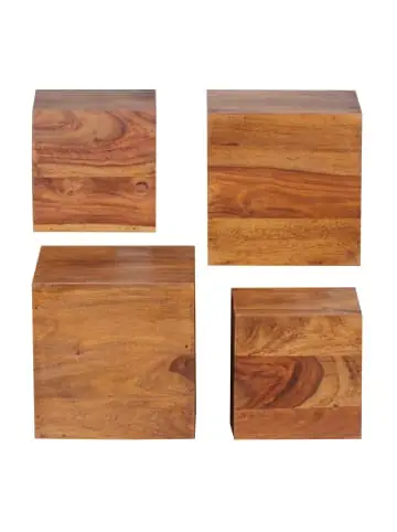 Artikelnummer: SuVa2482_1 EAN: 4250950230651Wofür geeignet? Das 4er Set Wandregale eignet sich ideal als Ablage über dem Fernseher oder im Flur – Montagematerial für Wandhalterung inklusive Pflegehinweise: Die Oberfläche mit einem lauwarm angefeuchteten Baumwolltuch reinigen; Keine Scheuermittel, scharfe Reinigungsmittel oder tropfnasse Tücher verwenden; Keine weitere Behandlung der naturbelassenen Oberfläche (Ölen, Wachsen) notwendig Design• Modernes massives Wandregal Set • 2 verschiedene Größen • 4er Set Wandkonsole mit einzigartiger MaserungAbmessungen Großer Cube• Breite: 25 cm • Höhe: 25 cm • Tiefe: 25 cmAbmessungen Kleine Cubes• Breite: 20 cm • Höhe: 20 cm • Tiefe: 20 cm • Holzstärke: 1,5 cmBesonderheiten• Gefertigt in Handarbeit • Jedes Regal ein Unikat • Innenfach nicht als Stauram gedacht • Offene Seite zeigt zur Wand • Vorrichtung zur Wandmontage an der offenen Seite der Regale Material• Sheesham Massivholz • Da es sich um Handarbeit und um ein Naturprodukt handelt kann es zu Farbabweichungen oder Unebenheiten kommenLieferumfang• 4 Wandregale • Montagematerial für die Wandbefestigung ist nicht im Lieferumfang enthalten, da dieses von der Wandbeschaffenheit abhängig ist • Lieferung ohne DekorationMontage• Lieferzustand: Montiert