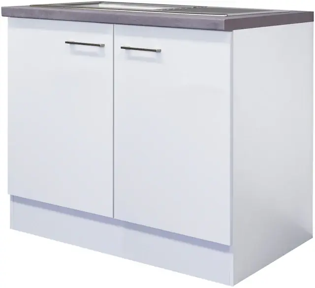Spülenunterschrank mit pflegeleichter Oberfläche von Flex-Well, Made in Germany. Inklusive Arbeitsplatte und Spüle. Mit 38 mm starker Arbeitsplatte, Metallgriff. Günstiger Küchenschrank in guter Qualität. Schnelle Lieferzeit bis in die Wohnung