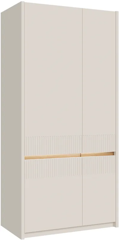moderner Kleiderschrank inklusive Beleuchtung. beide Türen sind mit Soft Close ausgestattet. die Einlegeböden und Kleiderstange bietet viel Platz. schafft Ordnung im Flur. die grifflosen Fronten und die Beleuchtung runden die Optik perfekt ab