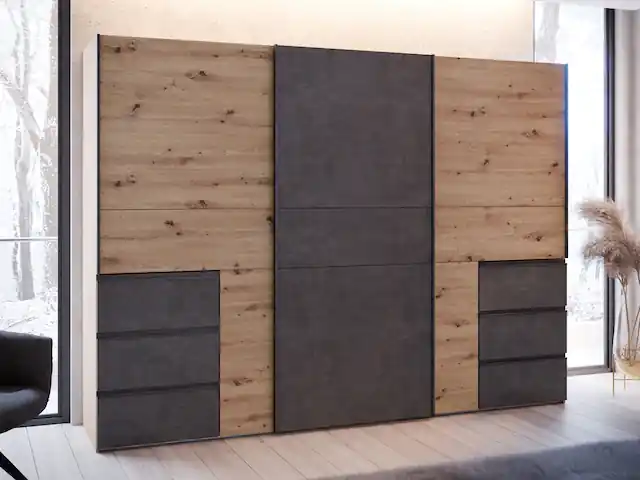 moderner großer Schwebetürenschrank, Höhe ca. 200cm. bietet eine Menge Stauraum und schafft Ordnung in Ihrem Zuhause. die 6 Schubkästen bieten Platz für Ihre Wäsche. die Metallgriffleisten passen sich optisch perfekt an das Design an. Zubehör ist optional bestellbar