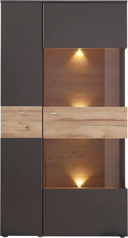 Erleben Sie moderne Eleganz mit unserem Highboard, das Funktionalität und stilvolles Design perfekt vereint.. Die Kombination aus Mauvella Eiche Weiss und edler Glastüre verleiht jedem Raum ein exklusives Ambiente.. Die integrierte LED-Belecuhtung der Einlegeböden setzt Ihre Lieblingsstücke gekonnt in Szene.. Dank der Softclose-Funktion schließen die Türen sanft und leise.. Gönnen Sie sich ein Möbelstück, das zeitgemäße Technologie und edles Design harmonisch vereint.