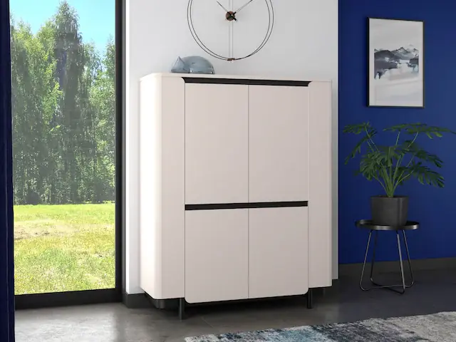 Highboard in moderner Trendfarbe. Türen mit Softclose Funktion. die Zweifarbigkeit ist ein Blickfang. hinter den beiden Türen bietet das Highboard viel Stauraum. die abgerundeten Ecken runden die Optik sehr gut ab