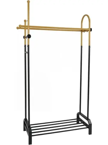 Beschreibung: Organisieren Sie Ihren Raum effizient mit diesem vielseitigen Kleiderständer, der Stil und Funktionalität vereint. Dieser Kleiderhänger verfügt über eine robuste Metallkonstruktion mit verstärktem U-förmigem Sockel, der eine stabile Unterstützung für Ihre Kleidungsstücke bietet. Die elegante Farbkombination aus Gold und Schwarz sowie die abgerundeten Kanten schützen Ihre Kleidung vor Kratzern und verleihen eine moderne Note. Die großzügigen Aufbewahrungsmöglichkeiten umfassen 2 Stangen – eine zum Aufhängen von Kleidung und eine weitere ideal für Schals oder Krawatten – sowie 5 Seitenhaken und eine zusätzliche Seitenstange für Mäntel oder Taschen. Zudem bietet das untere Regal optimalen Platz für Schuhe oder andere Gegenstände.Eigenschaften: Großer Stauraum mit Doppelstangen zum Aufhängen von Kleidungsstücken 5 Seitenhaken bieten zusätzlichen Platz für Mäntel und Taschen Eine zusätzliche Seitenstange erweitert die Hängemöglichkeiten Unteres Ablagefach zur Aufbewahrung von Schuhen und anderen Gegenständen Robustes Metall für stabile Unterstützung Verstärkter U-förmiger Sockel sorgt für mehr Stabilität Die Farbkombination Gold und Schwarz schafft ein modernes, stilvolles Erscheinungsbild Geeignet für Schlafzimmer, Waschküche, Kleiderschrank, Garderobe und Eingangsbereich Material: Metall, Kunststoff Gesamtabmessungen: 101 x 40 x 179 cm (L x B x H) Maximale Belastung der Kleiderstangen: 10 kg Maximale Belastung jedes Hakens: 1 kg Maximale Belastung des Ablagefachs: 20 kg Nettogewicht: 7 kgLieferungsumfang: 1 x Kleiderständer 1 x Anleitung