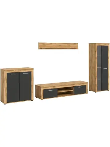 Jam Regal System grau, Eiche Dekor. Diese moderne Wohnkombination besticht durch ihr harmonisches Design und ihre hochwertige Verarbeitung. Mit den Maßen B/H/T: 330x159x35 cm bietet sie nicht nur eine attraktive Optik, sondern auch praktischen Stauraum. Die elegante Front in Grau und Wotan Eiche Nachbildung schafft eine ansprechende Kombination aus natürlicher Wärme und urbanem Chic. Die Wohnkombination verfügt über eine Glastür und einen Glasboden, die ideal sind, um Ihre Lieblingsstücke, wie dekorative Accessoires oder wertvolles Geschirr, stilvoll zu präsentieren. Gefertigt aus FSC®-zertifiziertem Holzwerkstoff, setzt dieses Möbelstück ein Zeichen für Nachhaltigkeit und den Schutz der Wälder. Diese Wohnkombination vereint Design, Funktionalität und Umweltbewusstsein in einem Möbelstück eine perfekte Ergänzung für jedes moderne Zuhause!