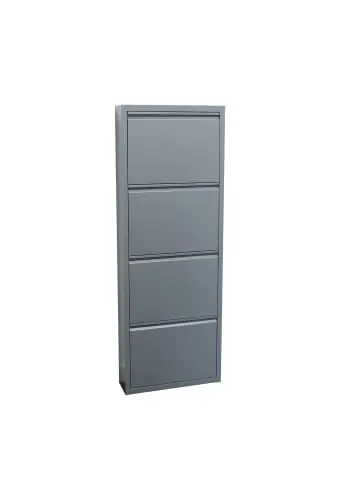 Schuhschrank Pisa mit 4 Türen in Metallgrau. Komplett montiert wird ein Schuhschrank in der Farbe Grau geliefert, der sowohl Stil als auch Funktionalität in Ihr Zuhause bringt. Komplett montiert geliefert. RAL 7031 grau. Schublade innen: B46/L29/T13 cm. Kann auf den Boden gestellt oder an die Wand gehängt werden. Einzeln verwendbar. Türen öffnen sich gleichzeitig. Dieses Produkt wurde mit viel Liebe zum Detail hergestellt, was sowohl Ästhetik als auch hohe Haltbarkeit gewährleistet. Bei der Gestaltung wurde sowohl auf Funktionalität als auch auf Stil geachtet, was es zur perfekten Wahl für jeden Raum in Ihrem Zuhause macht. Die verwendeten Materialien sind von hoher Qualität, was dem Produkt eine lange Lebensdauer verleiht und dafür sorgt, dass es dem täglichen Gebrauch standhält. Ob zur Aufbewahrung oder als dekorative Ergänzung, dieses Produkt wertet Ihre Einrichtung auf und bringt zusätzlichen Komfort und Eleganz in Ihr Zuhause.
