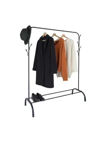 Sorge für Ordnung und Stil in Deinem Zuhause mit diesem eleganten, freistehenden Kleiderständer aus Eisen. Dank seiner robusten Konstruktion bietet er nicht nur eine stabile Aufhängemöglichkeit auf der Stange und 8 seitlichen Haken, sondern auch zusätzlichen Stauraum durch die untere Ablage. Ob im Schlafzimmer, Flur oder Ankleidezimmer – dieser Kleiderständer ist die perfekte Lösung zur Kleideraufbewahrung, ohne dabei auf Stil zu verzichten.Kleiderständer im Detail – Maße H x B x T: ca. 148 x 110 x 40 cm – Traglast Kleiderstange: ca. 14 kg – Traglast Ablage: ca. 30 kg – Traglast Haken: je ca. 2 kg – Material: Eisen, Kunststoff – In verschiedenen FarbenGarderobenständer mit Ablage und Haken – Für mehr Ordnung im Flur, Büro, Schlafzimmer etc. – Stopper-Kugeln auf Kleiderstange verhindern Herunterrutschen – Praktische Ablagefläche für Schuhe und Aufbewahrungsboxen – 8 seitliche Haken zum Aufhängen von Taschen oder Hüten – Modernes, dezentes Design passt in jede EinrichtungLieferumfang – 1x Kleiderständer in Einzelteilen – Montagematerial und Anleitung – Dekoartikel sind nicht im Lieferumfang enthalten