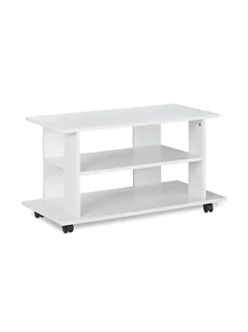 In diesem TV Board für ihr Wohnzimmer finden Sie Platz für allerlei Gegenstände. Ob Fernseher, Konsole, Receiver oder Zubehör, auf 2 Ablagen findet sich genügend Stauraum, um all diese Dinge unterzubringen. Die übrige Ablagefläche können Sie außerdem für die Aufbewahrung von CDs, DVDs, Zeitschriften und mehr nutzen. Besonderes Element sind an diesem TV Board die Rollen: Ganz einfach können Sie die Position des Fernsehers verändern und beim Staubsaugen schnell Platz machen. TV Board im Detail – Maße gesamt H x B x T: ca. 45 x 80 x 40 cm – Gewicht: ca. 10,5 kg – Maximale Tragkraft: ca. 15 kg pro Ablage – Material: PB (Particle Board), Papier, Kunststoff – In verschiedenen FarbenTV Bank mit Ablagen – Maße Ablagen B x T: ca. 60 x 34 cm – Abstand zw. Ablagen: ca. 17 cm – Platz zwischen den Streben seitlich: ca. 22,5 cm – Platz zwischen den Streben hinten: ca. 31 cm – Bodenfreiheit: ca. 5,5 cmFlexibles Lowboard mit Rollen – Für Fernseher, Konsole, Lautsprecher und mehr – Mit praktischen Rollen für Beweglichkeit – Platz für CDs, DVDs, Spiele und weiteres – Schlichtes Design mit Funktionalität vereint – Aufbewahrung von Zeitschriften, Zubehör und mehrLieferumfang – 1x TV Board in Einzelteilen – Anleitung – Montagematerial – Dekoartikel sind im Lieferumfang nicht enthalten