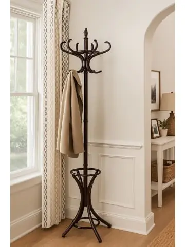 Eleganter Garderobenständer aus Massivholz – in 8 edlen Farben erhältlich.Bringen Sie stilvolle Ordnung in Ihr Zuhause mit diesem zeitlosen Garderobenständer aus massivem Birkenholz, der in acht attraktiven Farben erhältlich ist: Braun, Erle, Brombeere, Rot, Schwarz, Weiß, Natur und Mahagoni. So lässt sich das Modell perfekt an Ihre Einrichtung im Landhausstil, modern oder klassisch anpassen. Gefertigt aus hochwertigem Massivholz (Birke) und mit einem drehbaren Oberkranz (Ø 51 cm) ausgestattet, bietet der Garderobenständer 6 stabile Doppelkleiderhaken für Jacken, Taschen oder Hüte. Eine integrierte Schirmhalterung sorgt zusätzlich für praktischen Stauraum im Flur, Eingangsbereich oder Büro. Dank der stabilen Konstruktion mit einem Fußdurchmesser von 56 cm und einer Belastbarkeit von bis zu 20 kg ist dieser Kleiderständer nicht nur dekorativ, sondern auch äußerst funktional. Die Lieferung erfolgt zerlegt mit bebilderter Montageanleitung.Produktdetails im Überblick: Material: Massivholz Birke gebeizt & lackiert In 8 Farben wählbar: Braun, Erle, Brombeere, Rot, Schwarz, Weiß, Natur, Mahagoni Maße: Ø 56 cm x Höhe 184 cm Drehbarer Kranz: Ø 51 cm mit 6 Doppelhaken Zusatzfunktion: Regenschirmhalter Belastbarkeit: ca. 20 kg Lieferumfang: Zerlegt inkl. Aufbauanleitung (ohne Dekoration)Ob im modernen Eingangsbereich, im klassischen Flur oder im Büro mit Charakter – dieser hochwertige Garderobenständer sorgt für einen stilvollen ersten Eindruck und frischen Wind in Ihren Räumen. Jetzt entdecken und stilvoll Ordnung schaffen!- Kultiger Garderobenständer aus massivem Birkenholz – hochwertig verarbeitet- Drehbarer Oberkranz mit Ø 51 cm und 6 Doppelhaken für Jacken, Hüte & Accessoires- Integrierte Regenschirm-, Stockhalterung – praktische Zusatzfunktion- Maße: ca. Ø 56 x H. 184 cm – ideal für Flur, Diele, Büro oder Empfang- In 8 Farben wählbar – stilvolle Optik für jeden Eingangsbereich