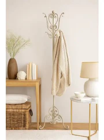 Romantischer Garderobenständer bzw. Kleiderständer aus Eisen mit einer antik cremeweißen Oberfläche beschichtet. Insgesamt 12 Kleiderhaken bieten viel Platz für Kleidung. Die Oberfläche im trendigen Vintage-Look ist mit gewollten Gebrauchsspuren gearbeitet, als hätte der Kleiderständer schon einiges erlebt. Maße ca. cm: B. 48 x T. 48 x H. 175 cm.- Pflegeleichte Oberflächen- Im trendigen Vintagelook- Mit Gebrauchsspuren- Schwere, stabile Ausführung aus Eisen