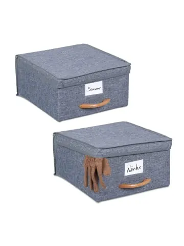 Diese Verstauboxen im 2er Set bringen Ordnung in Deinen Kleiderschrank. Egal ob Mützen, T-Shirts oder Socken, in den praktischen Stoffboxen findet alles seinen Platz und wird dank des Deckels vor Staub geschützt. Anschließend können die Aufbewahrungsboxen beschriftet und in den Schrank gestellt werden – der handliche Holzgriff an der Vorderseite erleichtert Dir das Herausziehen. Die Ordnungsboxen eignen sich zudem optimal zum Verstauen von anderen Utensilien in Schlaf-, Wohn-, oder Badezimmer.Aufbewahrungsbox im Detail – Außenmaße H x B x T: ca. 16 x 30 x 32,5 cm – Innenmaße H x B x T: ca. 15 x 28,5 x 29 cm – Volumen: je ca. 12 Liter – Traglast: bis 2,4 kg pro Box – Gewicht: je ca. 500 g – Material: Polyester, Kunststoff, Pappe, Buchenholz – Farbe: Grau, NaturRegalbox mit Deckel – Organisation für Kleiderschrank – Ideal für Saisonkleidung – Ordnungshelfer fürs Schlaf-, Wohn-, Bade- und Kinderzimmer – Perfekt für Kleinteile, Handtücher, Spielzeug, Kleidung etc. – Holzgriff erleichtert Herausziehen aus Regal und Kleiderschrank – Ordnungsbox bei Nichtgebrauch einfach zusammenfalten – Schlichte Boxen passen in jedes Raumkonzept – Im 2er Set – Deckel verbirgt Inhalte und schützt vor Staub – Mit Schild beschriftenLieferumfang – 2x Aufbewahrungsbox – Dekoartikel sind nicht im Lieferumfang enthalten