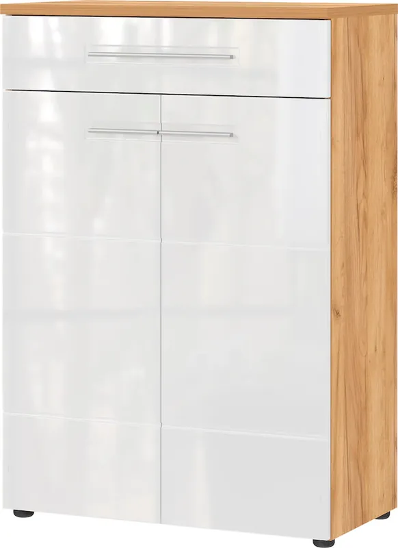 Verstellbare Einlegeböden zur individuellen Gestaltung. Türen und Schublade schließen durch Dämpfung sanft und geräuschlos. Steggriffe aus Metall. Fronten MDF in Hochglanz. Widerstandsfähige Oberflächenbeschichtung aus Melamin. Stoßfeste ABS-Kanten. Made in Germany