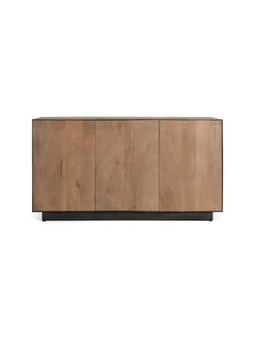 Dieses dreitürige Sideboard aus Mangoholz mit natürlicher Oberfläche betont die wunderschöne Maserung. Das minimalistische Design mit Push-to-Open-System macht Griffe überflüssig und sorgt für eine klare, moderne Ästhetik. Im Inneren bieten Regalböden praktischen Stauraum. Die Front wird von einem schwarzen Metallprofil eingefasst, das durch einen passenden Sockel ergänzt wird und einen eleganten Kontrast sowie einen Hauch von Industrie-Chic verleiht. ● Höhe: 81 cm ● Länge: 150 cm ● Breite: 44 cm ● Material: Mangoholz ● Farbe: Natur ● Gewicht: 65 kg ● Verpackungsmaße: 88 x 156 x 52 cm ● Keine Montage erforderlich Wood