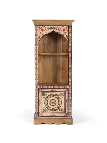 Bücherregal aus Mangoholz mit charmantem, handgefertigtem Design. Es verfügt über eine vertikale Struktur mit zwei offenen Fächern, die durch ein Regal getrennt sind, und einer unteren Flügeltür, ideal für die unsichtbare Aufbewahrung von Gegenständen. Der Frontrahmen ist mit bunten Blumenmotiven auf hellem Hintergrund handbemalt, einschließlich Details auf dem oberen Rand und dem unteren Sockel. Ideal als Bücherregal oder dekorative Vitrine, perfekt für rustikale, ethnische oder Vintage-Einrichtungen. TÜRGRÖSSE: 40 x 43 cm, REGALHÖHE: 44 cm, REGALGRÖSSE: 52 x 23 cm, DECKEL: 8 cm Wood