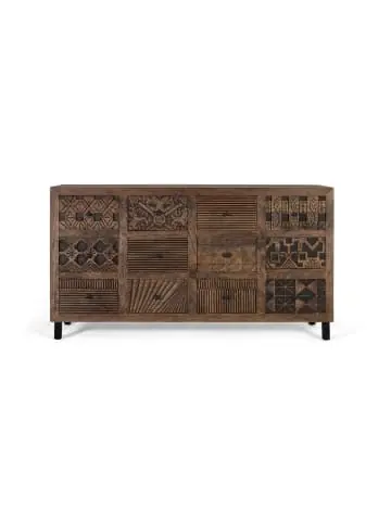 Sideboard aus massivem Mangoholz mit natürlichem Finish, das die Textur und den Farbton des Materials hervorhebt. Es besteht aus mehreren Schubladen und einer Tür, jede mit einem einzigartigen handgeschnitzten Reliefdesign mit geometrischen und ethnischen Motiven, die ihm einen starken dekorativen Charakter verleihen. Der schwarze Eisensockel sorgt für Stabilität und einen modernen Kontrast, der den handgefertigten Stil ausgleicht. Ideal als funktionales und dekoratives Möbelstück in Wohnzimmern, Esszimmern oder Fluren im rustikalen, Boho- oder modernen Stil. FRONTGRÖSSE: 19 x 33 cm, INNENSCHUBLADE: 16 x 30 x 32 cm, FUSSHÖHE: 11 cm, OBERFLÄCHE: 5 cm Wood