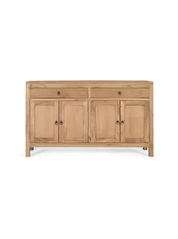Sideboard aus massivem Mindi-Holz, in einer natürlichen Farbe gehalten, die die Maserung und die warmen Töne dieses Holzes hervorhebt. Das Design verfügt über zwei große Schubladen oben und vier Türen mit Holzgriffen unten, die geräumige Fächer für zusätzlichen Stauraum verbergen. Ein Möbelstück, das in Esszimmern, Wohnzimmern, Eingangsbereichen oder sogar als zusätzliches Sideboard in Büros oder Studios verwendet werden kann. FRONTGRÖSSE – 11 x 63 cm INNENSCHUBLADENGRÖSSE – 9 x 60 x 28 cm REGALGRÖSSE – 67 x 35 cm REGALHÖHE – 21 cm DECKEL – 2 cm FUSSHÖHE – 11 cm Wood