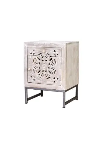 Nachttisch aus Mangoholz mit tiefer Schnitzerei. 1 Schublade, 1 Tür. Weiß gewaschen. Metallfüße 15 cm. Maße: 56 x 40 x 35 cm. Volumen: 0,08 m³. Gewicht: 11 kg. Wood