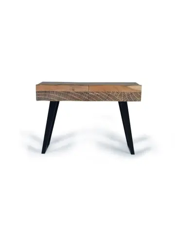 Konsole mit 2 Schubladen aus Akazienholz mit Metallfüßen in Naturton. Handgeschnitzte Fronten. Maße: 77 cm Höhe x 110 cm Breite x 40 cm Tiefe. Gewicht: 38 kg. Verpackung: 32 x 117 x 48 cm. Naturholz und Handarbeit, daher mögliche Abweichungen in Farbe und Maserung. Wood