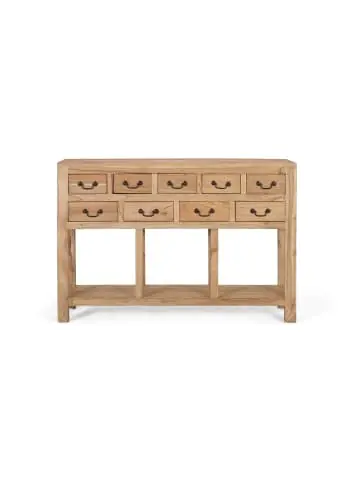 Flurkonsole aus Massivholz mit natürlichem Finish, das die Maserung und den warmen Farbton des Materials hervorhebt. Das Design verfügt über 9 Schubladen auf zwei Ebenen, alle mit Metallgriffen. Der untere Teil enthält ein offenes Regal, das zusätzlichen Stauraum oder Dekoration bietet. Perfekt, um Räumen im natürlichen, ländlichen oder kolonialen Stil Funktionalität und Wärme zu verleihen. FRONTGRÖSSE: 25 x 10 cm; INNENSCHUBLADENGRÖSSE: 8 x 22 x 22 cm; REGALGRÖSSE: 120 x 30 cm; REGALHÖHE: 35 cm; OBERSEITE: 2 cm; FUSSHÖHE: 8 cm Wood