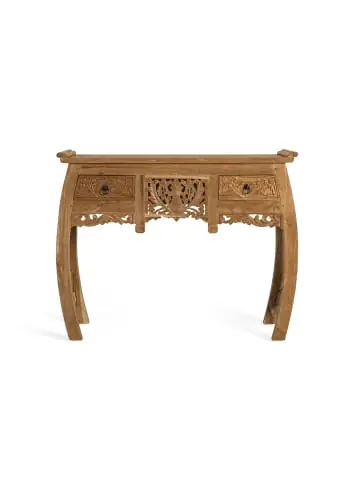 Dieser Konsolentisch aus massivem Teakholz in Naturfarbe mit handgefertigter Oberfläche besticht durch zwei handgeschnitzte Schubladen mit zarten floralen Motiven und ein durchbrochenes Mittelteil, das für optische Leichtigkeit sorgt. Die geschwungenen Beine verleihen dem Tisch Eleganz und Dynamik und schaffen eine unverwechselbare Silhouette. Dieses Möbelstück im balinesischen oder Kolonialstil ist ideal, um Eingangsbereichen oder anderen Wohnräumen Wärme und Charakter zu verleihen. Höhe: 78 cm, Länge: 100 cm, Breite: 37 cm, Nettogewicht: 18 kg, Bruttogewicht: 21 kg, Toleranz (± cm): 2 cm, Beinhöhe: 48 cm, Plattenstärke: 2,2 cm, Anzahl Schubladen: 2, Höhe der Front: 10,5 cm, Breite der Front: 25,5 cm, Schubladenführung: Holz, Rahmenmaterial: Teak, Plattenmaterial: Teak, Tür-/Frontmaterial: Teak, Beinmaterial: Teak, Farbe: Natur, Lackiert: Nein, Nachhaltiges Material: Ja, Montage erforderlich: Nein, Beschläge enthalten: Ja, Für den Hausgebrauch geeignet: Ja, Verpackungsmaße (1 Paket): 85 x 105 x 42 cm, Volumen (m³): 0,38 Wood