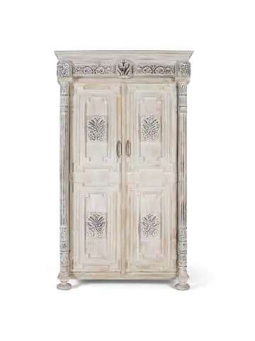 Zweitüriger Kleiderschrank aus Mangoholz, weiß gealtert, mit den Maßen 203 cm Höhe, 120 cm Länge und 50 cm Breite. Es besteht aus Mangoholz, wiegt 95 kg und wird in einer Box mit den Maßen 210 x 125 x 58 cm geliefert. Es ist keine Montage erforderlich und sein einzigartiger Charakter wird durch das mögliche Vorhandensein ursprünglicher Äste und Maserungen im Naturholz betont. Dieser Schrank besticht durch seinen bezaubernden Used-Look in Weiß und ist dank Mangoholz robust und verleiht Ihrem Raum einen Hauch von Eleganz. Wood