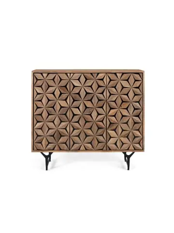 Sideboard aus massivem Mangoholz mit handgeschnitzter Front in einem dreidimensionalen geometrischen Muster, das Rauten- und Sternformen kombiniert und so einen handgefertigten und eleganten visuellen Effekt erzeugt. Es verfügt über drei in das Design integrierte Türen, hinter denen sich Innenregale zur Aufbewahrung verbergen. Der Sockel besteht aus Eisen in Form eines umgekehrten Y mit mattschwarzer Oberfläche, die für Stabilität und einen modernen Kontrast zum Set sorgt. Sein Stil verbindet Rustikales mit Modernem, ideal für Wohnzimmer, Esszimmer oder Flure mit Persönlichkeit. TÜRGRÖSSE – 68 X 32 CM REGALHÖHE – 34 CM FUSSHÖHE – 17 CM REGALGRÖSSE – 64 X 35 CM PLATTENSTÄRKE – 1,6 CM Wood