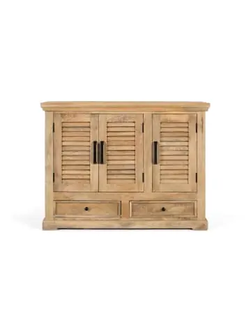 Dieses Sideboard aus Mangoholz in einem natürlichen Farbton besticht durch sein robustes Design, das jedem Raum Wärme und Charakter verleiht. Seine Struktur wird durch eine große Zierleiste auf dem Deckel hervorgehoben und die Vorderseite besteht aus drei Türen im mallorquinischen Stil, die sich durch ihre horizontalen Lamellen auszeichnen. Dahinter bieten breite Regale praktischen und übersichtlichen Stauraum. Zwei Schubladen unter den Türen ermöglichen die Aufbewahrung kleinerer Gegenstände und die schwarzen Eisengriffe sorgen für einen schlichten, handgefertigten Kontrast. Das Ganze ruht auf einem Sockel, der für Festigkeit, Stabilität und eine optisch ausgewogene Basis sorgt. FRONTMASSE: 12 x 48 cm, INNENSCHUBLADE: 10 x 44 x 28 cm, TÜRMASSE: 55 x 32 cm, REGALHÖHE: 27 cm, INNENREGAL: 70 x 32 cm, DECKEL: 6 cm Wood