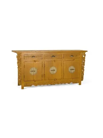 Sideboard mit 6 Türen und 3 Schubladen aus Mangoholz. Höhe: 84 cm. Länge: 180 cm. Breite: 40 cm. Material: Mangoholz. Farbe: Ocker. Gewicht: 67 kg. Naturholz und Handarbeit, daher mögliche Abweichungen in Farbe und Maserung. Wood