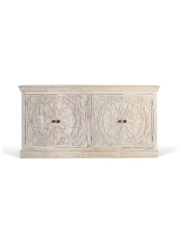 Dieses Sideboard ist aus Mangoholz gefertigt. Seine sandfarbene Oberfläche hebt die Textur und Maserung des Holzes hervor. Das Stück besteht aus vier handgeschnitzten Vordertüren mit zarten handgefertigten Motiven, die eine unverwechselbare und künstlerische Note verleihen. Im Inneren befinden sich geräumige Regale mit großem Fassungsvermögen. Abgerundet wird das Design durch eine dekorative Formgebung oben und einen unteren Sockel, der die Stabilität und Ästhetik verstärkt. Die mattschwarzen Griffe bilden einen dezenten Kontrast zur hellen Lackierung der Möbel. TÜRMASSE: 67 x 39 cm, REGALHÖHE: 33 cm, INNENREGAL: 84 x 31 cm, DECKEL: 7 cm Wood