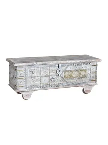 Truhe aus Mangoholz, weiß gekälkt, mit Bronzeapplikationen. Maße: 46 x 116 x 40 cm. Volumen: 0,25 m³. 1 Paket. Verpackungsmaße: 49 x 120 x 44 cm. Gewicht: 28 kg. Naturholz und Handarbeit, daher mögliche Abweichungen in Farbe und Maserung. Wood