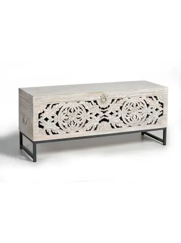 Truhe mit aus Mangoholz und Metall. Artikelmaße: 50cm Höhe -116cm Länge – 40cm. Artikelgewicht: 17kg. Wood