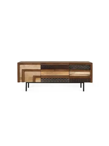 Dieser TV-Schrank zeichnet sich durch sein Design aus, das verschiedene Holzoberflächen mit geometrischen Reliefs und Texturen kombiniert. Hergestellt aus Mangoholz, präsentiert er dank der Mischung aus hellen, mittleren und dunklen Tönen eine optisch reiche Komposition. Der Schrank verfügt über zwei Türen an den Seiten und drei Schubladen in der Mitte. Sein asymmetrisches Design und die kontrastierenden Materialien lassen jedes Modul individuell hervorstechen und machen den Schrank nicht nur zu einem funktionalen Möbelstück, sondern auch zu einem dekorativen Element mit viel Persönlichkeit. FRONTGRÖSSE – 53 x 12 cm INNENSCHUBLADENGRÖSSE – 8 x 46 x 30 cm TÜRGRÖSSE – 37 x 43 BEINHÖHE – 16 cm PLATTENSTÄRKE – 1,6 cm Wood