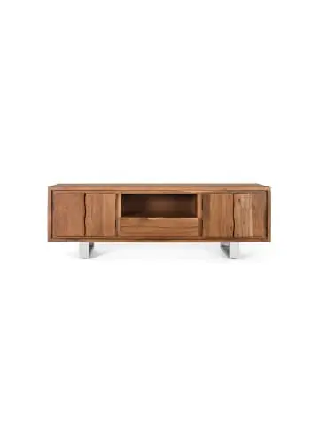 Dieses TV-Möbel mit 4 Türen und 1 Schublade besteht aus massivem Akazienholz mit Metallbeinen und ist mit Metallschienen ausgestattet. Seine natürliche Farbe und die silbernen Beine verleihen ihm ein modernes Aussehen. Aufgrund seiner natürlichen Holzbeschaffenheit kann es originelle Ast- und Maserungsmuster aufweisen. Darüber hinaus verfügt es über rutschfeste Polster, um die Möbel zu stabilisieren und die Böden zu schützen. Seine Maße von 56 cm Höhe, 170 cm Länge und 40 cm Breite bieten funktionalen Platz für Ihre Multimedia-Ausstattung. Es wiegt 60 kg, wird in einer Verpackung mit den Maßen 50 x 175 x 45 cm geliefert und muss zusammengebaut werden. Kartonmaße: 50 x 175 x 45 cm Maße des Stücks: 56 x 170 x 40 cm Gewicht: 66-60 kg Schubladenmaße: 14 x 60 cm Innenmaße der Schublade: 9 x 53 x 31 cm Türmaße: 33 x 23 cm Regalmaße: 58 x 35 cm Höhe der Beine: 14 cm Maße des Fachs innerhalb der Tür: 32 x 48 cm Höhe des Regals: 18 cm Schienen: Metallisch Verschluss: Magnetisch Stärke der oberen Platte: 2,5 cm Rückwand: MDF Wood