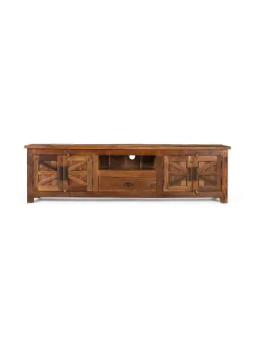 Dieser aus recyceltem Holz gefertigte TV-Ständer kombiniert ein rustikales und funktionales Design mit einer robusten Struktur. Das Design besteht aus einer großen zentralen Schublade und einem offenen Raum direkt darüber. An den Seiten verbergen zwei Holztüren geräumige Fächer und bieten zusätzlichen Stauraum für Bücher, Filme oder andere Gegenstände, die Sie geordnet und außer Sichtweite aufbewahren möchten. Die schlichten Linien und das gealterte Aussehen des wiederverwerteten Holzes verleihen ihm einen einzigartigen Charme. FRONTMASSE: 15 x 61 cm, INNENSCHUBLADE: 13 x 57 x 29 cm, TÜRMASSE: 37 x 31 cm, REGALHÖHE: 18 cm, FUSSHÖHE: 6 cm, INNENREGAL: 73 x 31 cm, DECKEL: 3 cm Wood