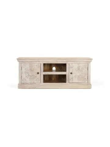 Dieser TV-Ständer vereint Eleganz und Funktionalität und ist aus massivem Mangoholz mit sandfarbenem Finish gefertigt. Sein Design umfasst eine zentrale Nische mit zwei Regalen, ideal für elektronische Geräte, und zwei Seitentüren, die mit handgeschnitzten geometrischen Figuren verziert sind. Eine Zierleiste unter dem Deckel und eine Fußleiste an der Unterseite vervollständigen die klassische Ästhetik. Dieses Stück bietet nicht nur Funktionalität, sondern fügt jedem Wohnzimmer auch ein einzigartiges dekoratives Element hinzu. TÜRMASSE: 39 x 39 cm, REGALHÖHE: 19 cm, INNENREGAL: 47 x 30 cm, DECKEL: 6,5 cm Wood